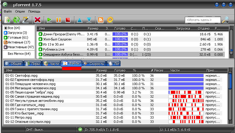 FAQ - Торрент-ссылки: как ими пользоваться? FAQ - Магнет-ссылки: как ими пользоваться? FAQ - Как докачать новую серию, если раздача ведётся путём добавления новых серий FAQ - Как скачать отдельные файлы из презентации FAQ - Как закачать отдельный файл - 2 FAQ - Как докачать пропущенные файлы торрента 2. Заходим на вкладку "Files (Файлы)". 3. И меняем нажатием правой кнопкой мыши приоритет на "Normal (нормальный)". В клиенте uTorrent ![]() 2) Заходим на вкладку "Files (Файлы)". ![]() 3) И меняем нажатием правой кнопкой мыши приоритет на "Normal (нормальный)". ![]() P. S. За инструкцию спасибо Jackу_Sparrow FAQ - От чего зависит скорость передачи-скачивания Причины низкой скорости могут быть разными. Основные: Сетевой порт - условное число от 1 до 65535, указывающее, какому приложению предназначается пакет (подробнее см. http://ru.wikibooks.org/wiki/TCP/IP и http://ru.wikibooks.org/wiki/Порт). Каждый клиент одновременно устанавливает соединения с другими клиентами (исходящие соединения) и ждет когда с ним установят соединение другие клиенты (входящие соединения). Закрытые порты означают что входящие соединения не возможны (остаются только исходящие). Но представьте? что у другого пира, с которым Ваш клиент пытается соедениться, тоже закрыты порты, получается он не может принять Ваше исходящее соединение? а Вы его, т.е. обмен данными с ним невозможен!!! Ситуацию может исправить третий пир подключившийся к обмену данными, у которого открыты порты, он сможет установить соединение с Вами и другим пиром, и через него пойдет обмен данными. Нужно заметить, что ситуация, когда у двух пиров закрыты порты, далеко не редкость. При большом количестве пиров/личеров закрытые порты не будут сильно снижать скорость закачки/отдачи, т.к. высока вероятность того, что найдется еще хотя бы один пир с открытым портом. При малом количестве как повезёт. Можно ли открыть закрытые порты? Это зависит от Вашего типа подключения к интернет и Вашего провайдера. В частности, если Вы находитесь за NAT провайдера, то порты открыть не получится. Так же порты могут быть закрыты самим провайдером. В остальных случаях порты открыть можно. Как определить, за NAT Вы или нет? Для внтренних адресов специально выделенны три диапазона IP: 10. 0. 0. 0 - 10. 255.255.255 172. 16. 0. 0 - 172. 31.255.255 192.168. 0. 0 - 192.168.255.255 Если Ваш IP принадлежит одному из этих диапазонов, то Вы точно находитесь за NAT. Как узнать свой IP? В Windows 2000/XP выберите кнопку "Пуск" > "Выполнить" и наберите команду cmd В появившемся Dos-окне выполните команду ipconfig Код: Windows IP Configuration Ethernet adapter Local Area Connection: IP Address. . . . . . . . . . . . : 192.168.1.10 Subnet Mask . . . . . . . . . . . : 255.255.255.0 Default Gateway . . . . . . . . . : 192.168.1.1 Если IP начинается с 192.168. или 172. , 10. , то он серый. В других случаях - белый. Если Вы за NAT (у Вас серый IP). Что делать? Нужно определить, где находится NAT, у вас или у провайдера. Если NAT находится у провайдера, Вы уже ничего не сделаете, входящие соединения будут недоступны. В такой ситуации можно купить белый IP у своего провайдера, если он предоставляет такую возможность. Если NAT находится у Вас, то нужно настроить роутер и фаейрвол (он же брендмауер, он же сетевой экран). Некоторые роутеры поддерживают функцию UPnP которая позволяет автоматически настроить port forwarding. Для этого нужно в настройках клиента найти и задействовать UPnP. Если это не поможет, то нужно, настраивать роутер вручную. Если у Вас белый IP, что нужно сделать, чтобы открыть порт(ы)? Необходимо настроить файрволл. Ка